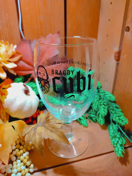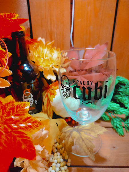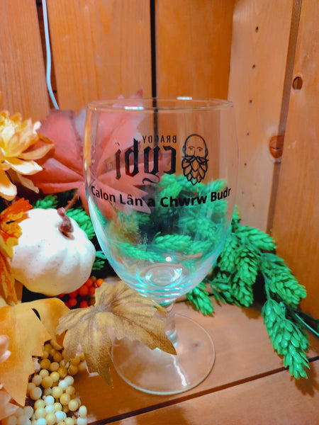 Full pint stem glass with the Bragdy Cybi logo and the "Calon Lan a Chwrw Budr" slogan: "A pure heart and a cheeky pint"